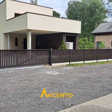 Montuojami yra vieno pločio aliuminio profiliai su vienodais arba skirtingais tarpeliais. Toks tvoros dizainas atrodo subtiliai ir šiuolaikiškai.