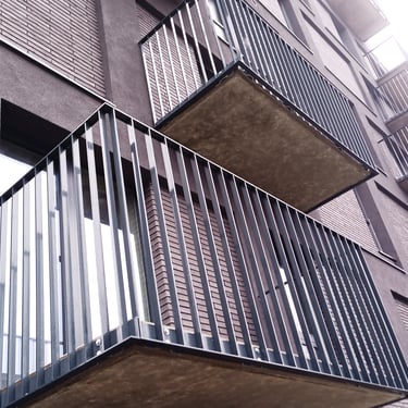 Balkonų turėklai su horizontaliai išdėstytais GA110 aliuminio profiliais. Galimas įvairus užpildo eilių skaičius bei išdėtymas. Porankis yra gaminamas iš 80x40mm aliuminio profilių, statiniai- 40x40mm.